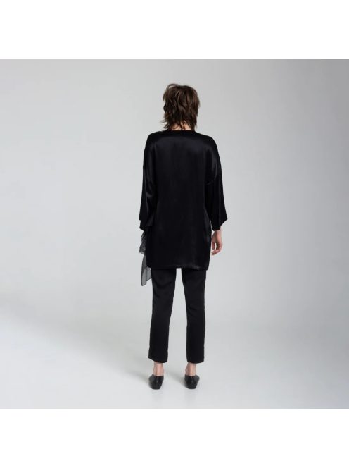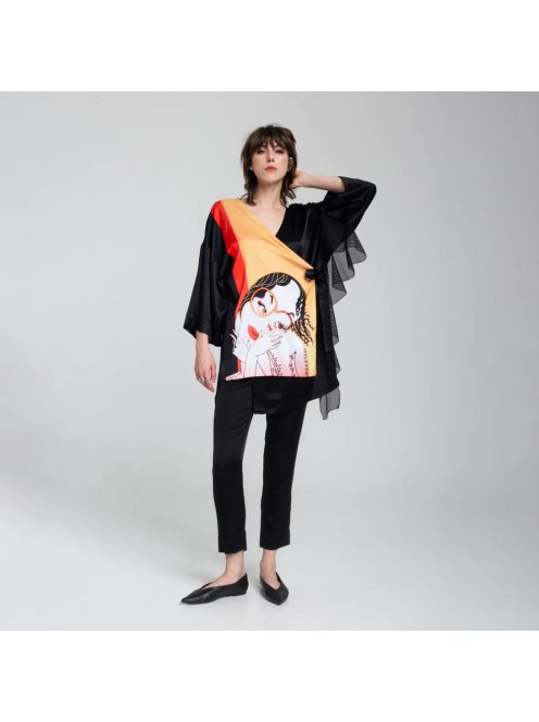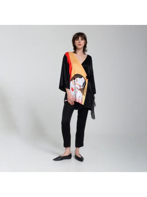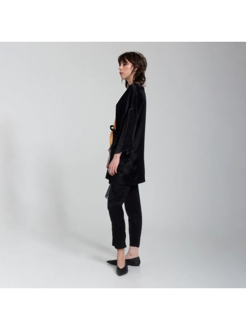 Az Anni Satin Kimono egy többcélú darab, amely farmernadrágos póló vagy extravagáns nappali viselet fölé is hordható, oldalán egy fodros részlet található.