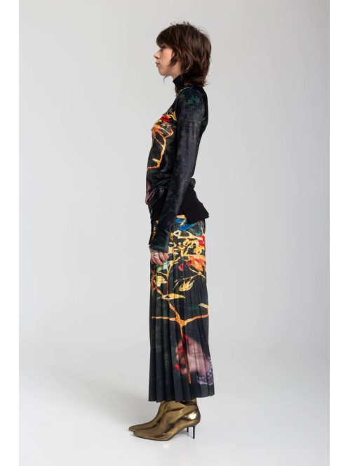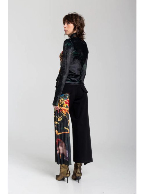 Átlapolt culotte, redőzött részlettel. Egyedi, színes nyomatát Duliskovich Bazil magyar-ukrán festő alkotásaiból készítették. Bazil festményeinek rétegei és esztétikája a fő ihletője ennek a kollekciónak. Párosítsa bársony felsőnkkel.