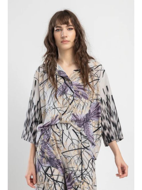 A RIZZ blúz a mindennapi kedvenced. A bő szabású dizájn és a 3/4 hosszú ujjak kényelmes és elegáns megjelenést biztosítanak, míg a gombos záródás átlátszó gombokkal egy csipetnyi eleganciát ad. Egyedülálló mintájával ez a blúz minden ruhát feldob, és a kifinomult nő számára kötelező darab. Tedd teljessé a megjelenést a RIZZ nadrággal.