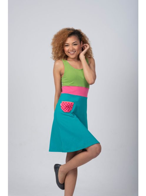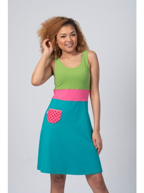 Szia, megérkezett a nyár! Élhetővé teheti az elviselhetetlen hőséget, ha ezt az ujjatlan, vékony, elasztikus pamutból készült rövid ruhát választja. A mellnél és a deréknál illeszkedik, és a derék alatt lazán folytatódik egy A-vonalú szoknyarésszel. Van rajta egy vicces kis patch zseb.