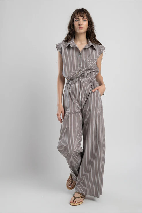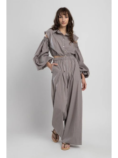 A COAST High-Rise Pants meleg tónusú változata. Ezek a nadrágok elegáns hétköznapi egyensúlyt teremtenek, széles szárvágással és magasan emelkedő aszimmetrikus derékkal a menő és exkluzív megjelenés érdekében. Szürke csíkos pamutkeverékből készült, rugalmas anyagból készültek, így minden nyári alkalomra tökéletes kiegészítők.