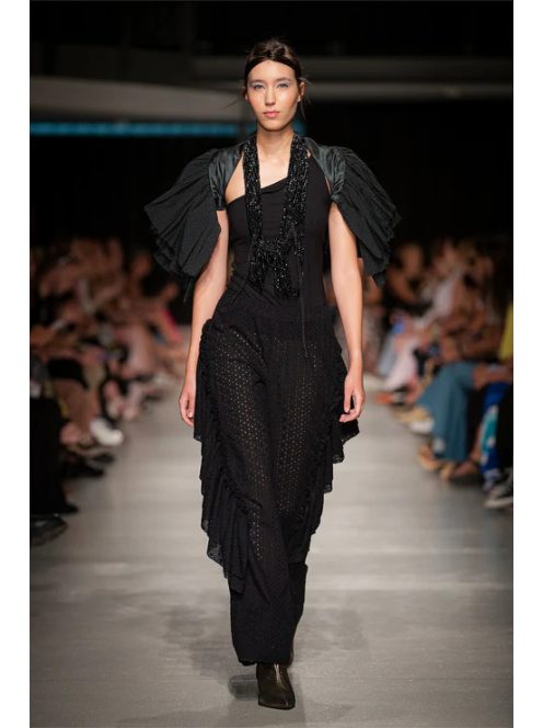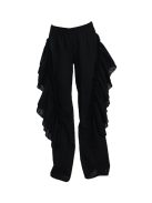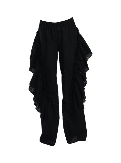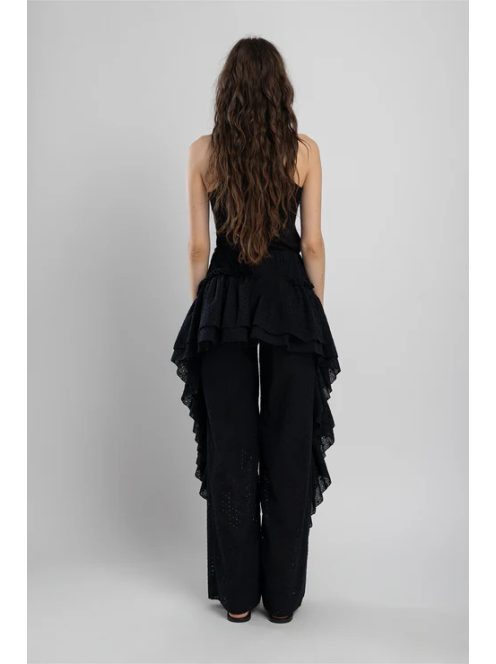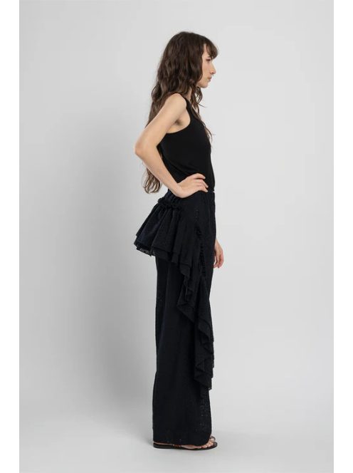Ez a rugalmas derékpánttal kiegészített palazzo nadrág könnyed stílust áraszt. Mindkét lábát finom fodrokkal díszítve, az elegáns, magas felülettel egy kis játékosságot adnak az egyszerű fekete színhez.