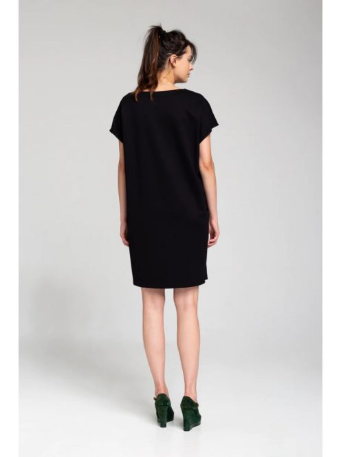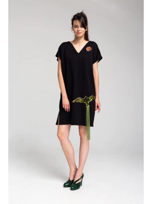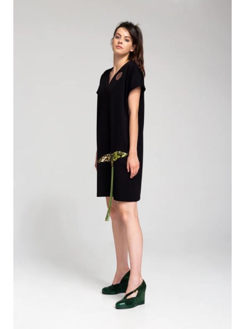 Könnyű V-nyakú miniruha, szoknyáján flitteres madárrészlettel.