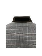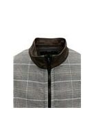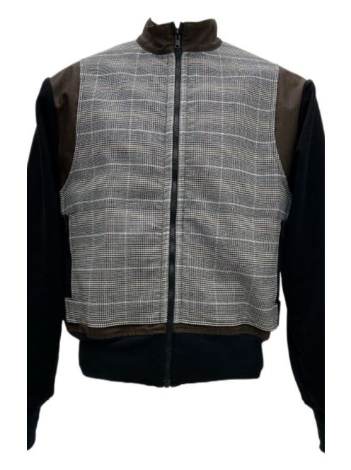 A spring jacket made from linen denim, Amercian fleece and checked fabric. The garment is equipped with a zipper closure and side pockets. Casual elements such as the zipper details and elasticized bottom band infuse the garment with sportswear-inspired accents while the soft colors highlights the jacket’s elegance.