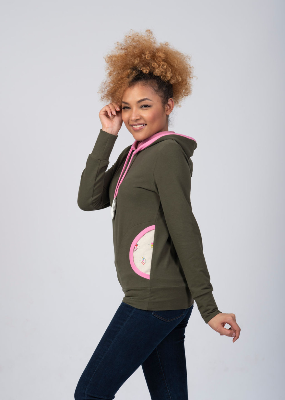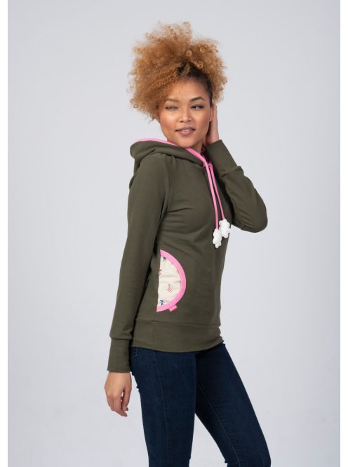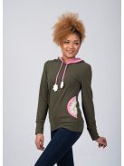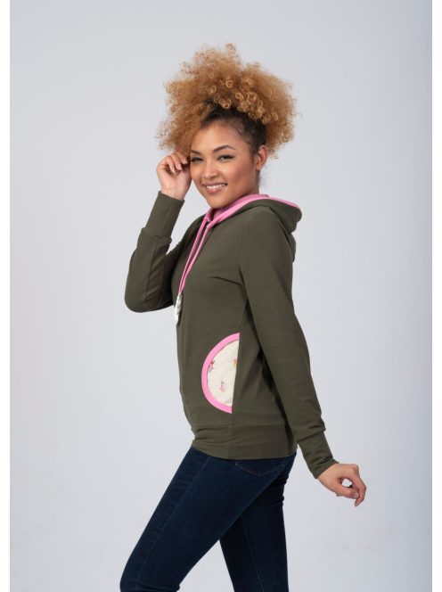 Ez a hosszú ujjú pulóver derékban enyhén illeszkedik. Kapucnival és mindkét oldalán mintás zsebekkel. Pamutból és elasztánból készült, anyaga elég rugalmas (8-9 cm, amit érdemes szem előtt tartani a méretválasztásnál) és minden évszakban hordható!