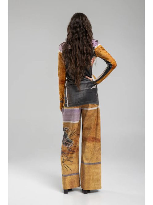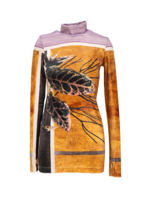 A puha, rugalmas bársony dzsörzé szövet, az egyedi színes nyomat és a hosszúkás szabás merész és szemet gyönyörködtető megjelenést kölcsönöz. Maradjon meleg és divatos a garbónyakú dizájnnal és a hüvelykujjvég mandzsettáival.