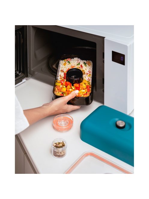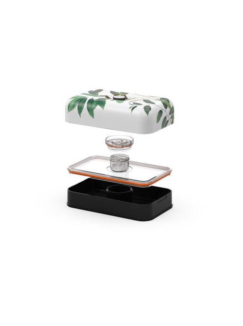 Rozsdamentes acél külső burok teljesen hermetikusan záródik a BPA mentes műanyagból készült belső étel tartóra, és a tetejébe süllyesztett tritán öntettartóra.