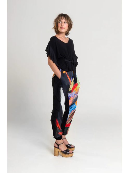 Kovásznai György, a szabad szellemű, univerzális művész alkotása látható. Elöl sztreccs poliészter szaténból, hátul fekete viszkóz dzsörzéből készült a nagyobb kényelem és szabadság érdekében.