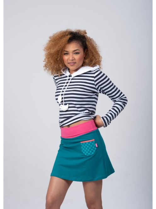 Ez egy rövid A-vonalú szoknya, közepes vastagságú pamutból. A fontos jellemző itt a derékrész, ami egy 15 cm-es hajtásból készül, amit tetszés szerint hosszabbíthat vagy rövidíthet, hogy a legjobban illeszkedjen. Ez a hajtás lehetővé teszi a has körüli szorítás elkerülését, így rendkívül kényelmes viselet. További bónusz, hogy a korábbi szakaszokban terhes barátaink is viselhetik! És ők is szeretik!