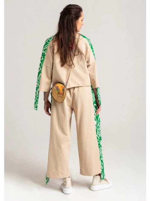 Egyenes széles szárú nadrág mindkét oldalán absztrakt grafikai részletekkel. Gumis derékkal rendelkezik a kényelmes megjelenés érdekében.
