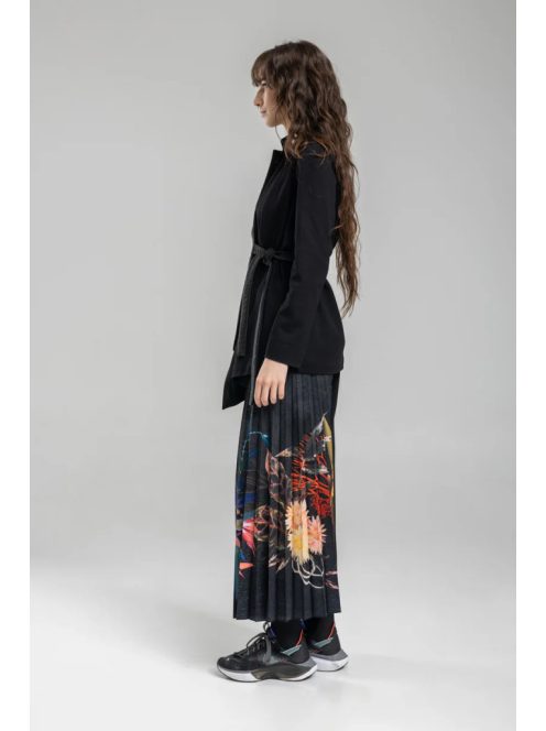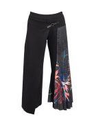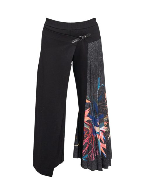 Ezek az egymást átfedő aszimmetrikus darabok elegáns megjelenést kölcsönöznek.Az egyik lábon egyedi, színes, élénk virágnyomott pliszével díszítettek. Kényelmes, közepes súlyú fekete viszkózkeverék textilből készült, amely egyedülálló, könnyed illeszkedést biztosít. A bokáig érő, aszimmetrikus kialakítás gyönyörű sziluettet alkot. A rugalmas derékvonal praktikusabbá teszi ezt a szabást. Tapasztalja meg a modern dizájn és az időtlen elegancia tökéletes kombinációját a BEAUTY átlapolt bokahosszúságú culott-cipőinkkel.